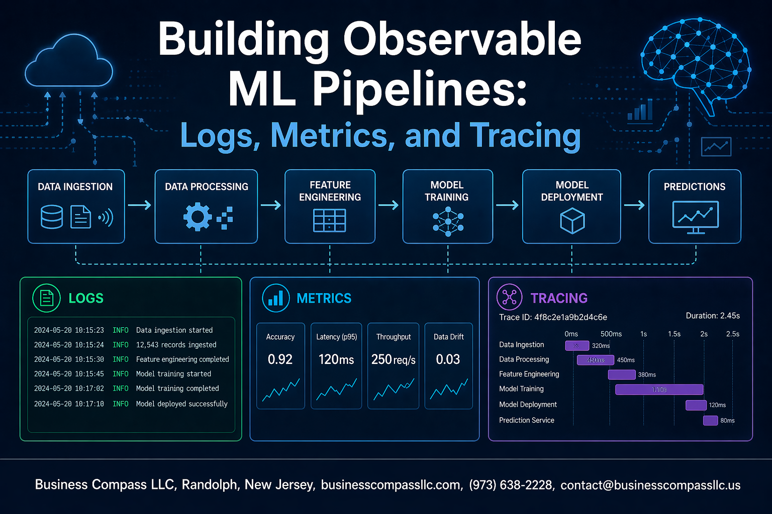 We’ll walk through the three pillars of observable ML systems: structured MLOps logging that captures every decision your pipeline makes, robust ML metrics collection that tracks both technical performance and business impact, and distributed tracing machine learning workflows to understand how data flows through complex, multi-service architectures. You’ll also learn how to set up intelligent MLOps alerting that cuts through the noise and helps your team respond quickly when things go wrong.